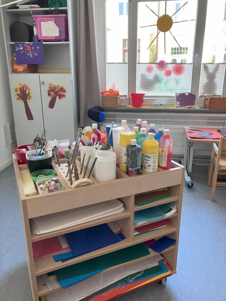 Um diesen Raum optimal nutzen zu können, wurde ein Atelierwagen benötigt. Dieser bietet oben Platz für Farbflaschen, Scheren, Pinsel und weiteres Material. Im unteren Bereich verfügt er über unterschiedlich große Fächer zur Lagerung von Papier oder zur Aufbewahrung der Kinderkunstwerke während des Trocknens. Aufgrund der Flexibilität des Wagens kann er je nach Bedarf im Raum bewegt und entsprechend genutzt werden.